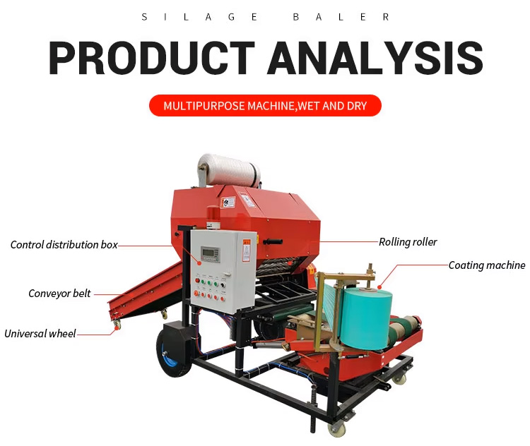 This fully automatic silage baler and wrapper combines baling and wrapping in one efficient system, powered by a 5.5kW motor to achieve a high-speed output of 60–70 bales per hour. Designed for versatility, it handles nearly all silage types—including fresh or dry straw from wheat, rice, soybean, corn, and more—producing dense, uniform bales at 450kg/m³.