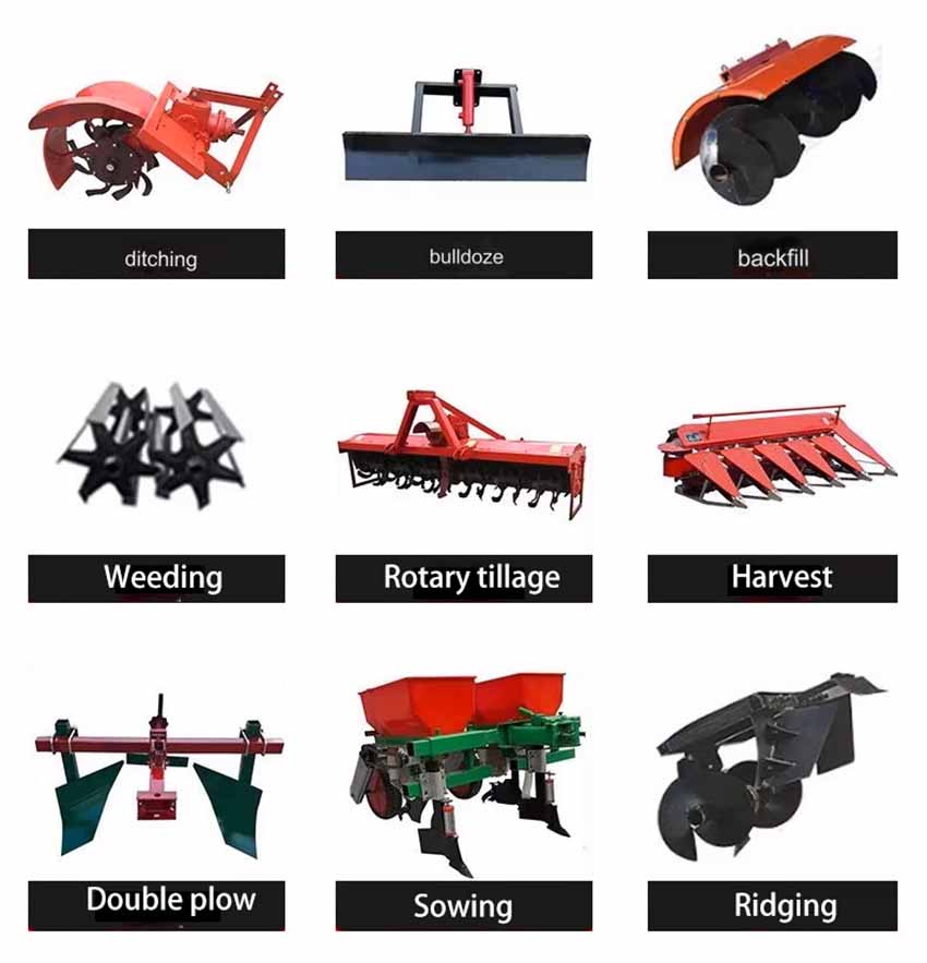 It is suitable for greenhouses, orchards, farms and vegetable plot,tea garden, wasteland, hills, dray land, plain and so on. It can match with many farm tool, such as seeder,weeding, backfill ,dig, ridging, fertilizer applicator, harvester,double plough,grass crusher, dozer blade, rotary tillage, corn planter, maize harvester and so on.