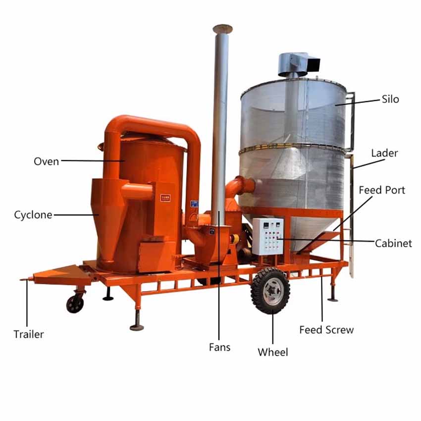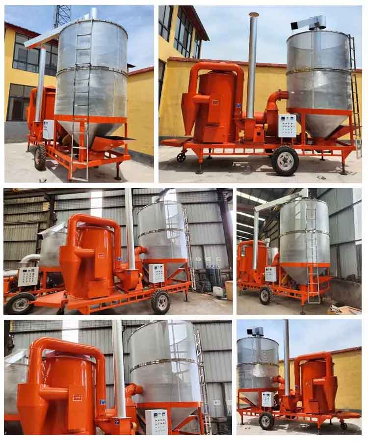 he grain dryer machine is a new design mobile dryer machine, it can be used for one machine and to dry various grain materials like the paddy rice, rapeseed, corn, wheat, soybean, sorghum and other grain materials. It can make grain heat and precipitate uniformly, ensure the quality of grain after drying. The drying equipment is very suitable for food processing plant, farms, grain station, cooperatives, grain and oil processing plant and other industry.