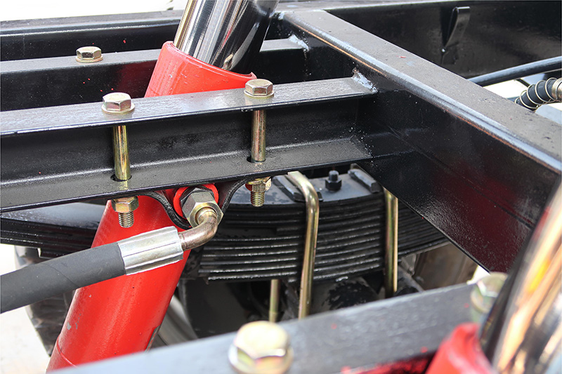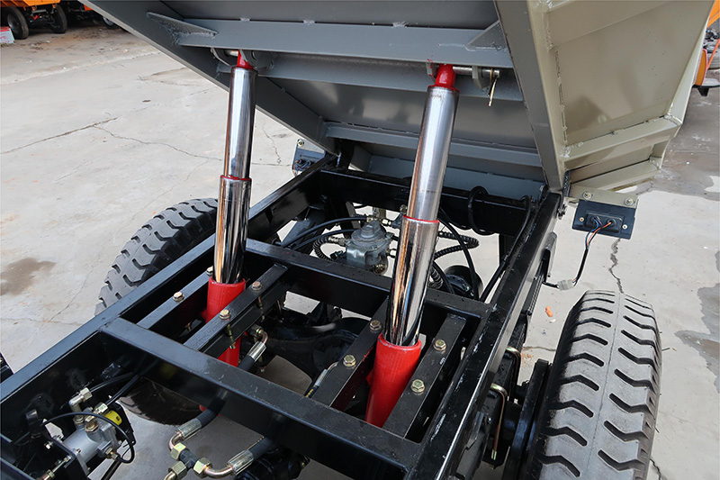 Dual hydraulic lifting devices are used to provide sufficient support for the bucket when holding materials, and can tilt the bucket to a greater extent when unloading, ensuring the stability of the body and facilitating unloading.