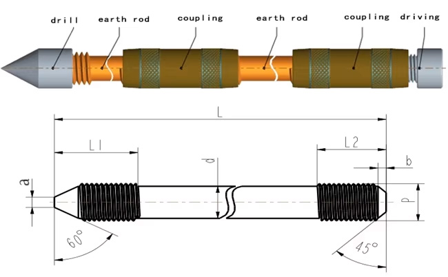 The dual-thread earth rod is equipped with coaxial connector, drive head and drill bit.The length of the cast copper ground rod can be arbitrarily increased.The driving head (connecting bolt) is used to connect the item end, which is used for striking when the rod is deep.The end is connected with a special bit (connecting bolt) to make it easier to hit the bar deep.